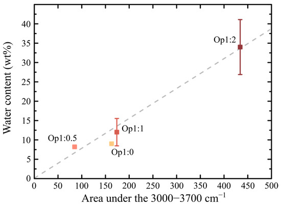 The large band between 900 and 1100 cm−1 encompasses several components, as revealed by multiple shoulders at 910, 970, and 1065 cm−1, which are attributed to vibration modes of the silica structure [79,80,81,82,83,84,85]. The 1025 cm−1 contribution regularly decreases in intensity from sample Op1:0 to Op1:2, and, hence, with increasing hydrogel proportion.