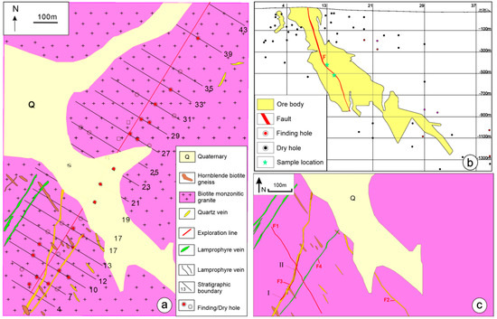(a) Geological map of the Jinqingding gold deposit in Rushan City, Shandong Province. (b) Longitudinal section of ore body No. II in Jinqingding gold deposit. (c) Jinqingding area structural schematic diagram (revised according to the mining area information).