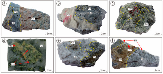 Schematic diagram of alteration types in the Jinqingding ore deposit. (a) Potassium feldspar alteration. (b) Sodium feldspar alteration. (c) Sericite alteration. (d) Chlorite alteration. (e) Pyrite sericite alteration. (f) Limonite alteration. Abbreviations: Q = Quartz; Bt = Biotite; Kfs = Potassium feldspar; Ab = Sodium feldspar; Chl = Chlorite; Ser = Sericite; Py = Pyrite; Ccp = Chalcopyrite; Cal = Calcite; Lm = Limonite alteration.