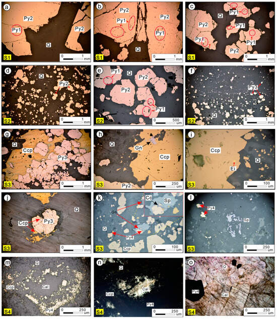 Typical microscopic characteristics of different stages of the Jinqingding deposit. (a) Different mineral characteristics in the pyrite–quartz stage (stage 1); (b) different mineral characteristics in the quartz–pyrite stage (stage 2); (c–k) different mineral characteristics in the quartz–polymetallic sulfide stage (stage 3); (l–o) different mineral characteristics in the quartz–carbonate stage (stage 4). Abbreviations: Py = Pyrite; Ccp = Chalcopyrite; Sp = Sphalerite; Gn = Galena; Q = Quartz; Ei = Argentite; Cal = calcite.