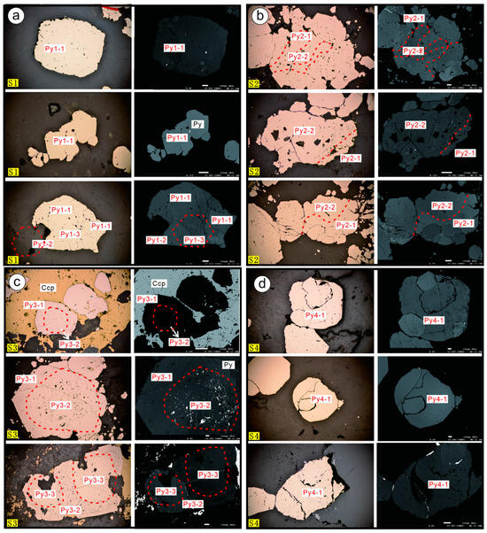 Division of generations of pyrite in the Jinqingding gold deposit metallogenic stage. (a) Characteristics of pyrite in stage 1; (b) Characteristics of pyrite in stage 2; (c) Characteristics of pyrite in stage 3; (d) Characteristics of pyrite in stage 4. Abbreviations: Py = Pyrite; Ccp = Chalcopyrite; S1 = Stage 1; S2 = Stage 2; S3 = Stage 3; S4 = Stage 4.
