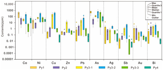Trace elements mainly exist in pyrite in the following ways: (1) in the form of solid solution in the mineral lattice; (2) in the form of invisible sulfide nanoparticles; and (3) in the form of visible micron-sized sulfide inclusions [41]. By combining box plots and elemental scatter plots, the content variation characteristics of various elements in the mineralization stage can be clearly discussed.