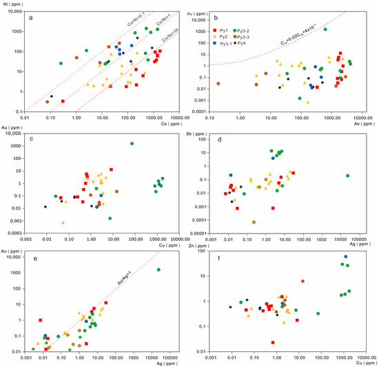 Scatter plot of trace elements in pyrite from different mineralization stages of the Jinqingding gold deposit. Diagrams of Co versus Ni (a), As versus Au (b), Cu versus Au (c), Ag versus Sb (d), Ag versus Au (e), and Cu versus Zn (f) contents of pyrite at different mineralization stages.