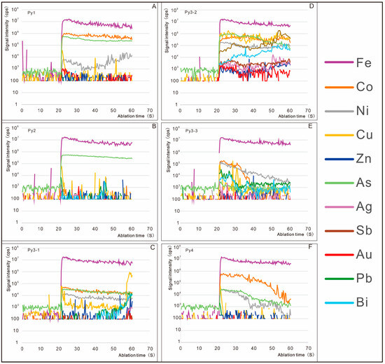 Representative LA-ICP-MS depth-concentration profiles (time vs. intensity) of trace elements in pyrite during the gold mineralization stage of the Jinqingding gold deposit. (A) Laser denudation curve of pyrite in stage 1; (B) Laser denudation curve of pyrite in stage 2; (C) Laser denudation curve of the first generation pyrite in stage 3; (D) Laser denudation curve of the second generation pyrite in stage 3; (E) Laser denudation curve of the third generation pyrite in stage 3; (F) Laser denudation curve of pyrite in stage 4.