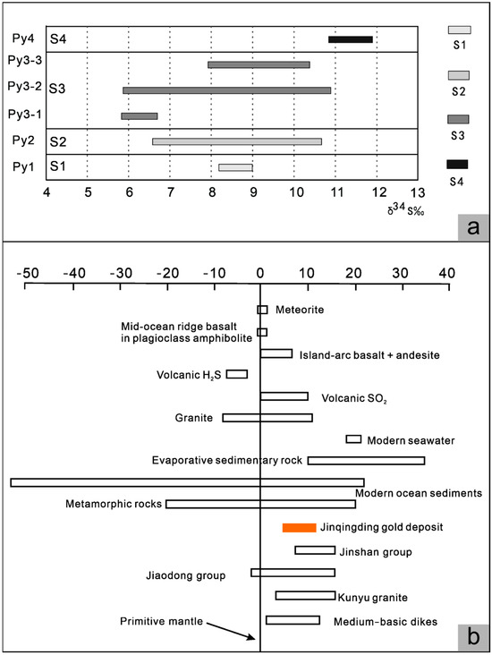 (a) Distribution of sulfur isotope compositions of pyrite in different metallogenic epochs of the Jinqingding ore deposit, (b) comparison of sulfur isotope compositions between the Jinqingding gold deposit and the Jiaodong Group.