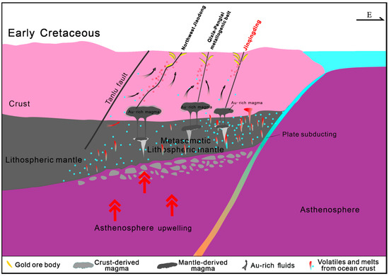 The formation of the Jinqingding gold deposit is closely related to the deep mantle fluids. The components of the transformation of the mantle → lithosphere–mantle interaction → end-stage mineralization are interrelated. In the Late Jurassic, a series of lithosphere thinning and asthennosphere upwelling events caused thickening and remelting of the lower crust, leading to a series of magmatic activities in the Jiaodong area. In the Early Cretaceous, the interaction between the lithosphere and asthenosphere gradually intensified. The participation of asthenosphere materials resulted in the formation of the Kunyu Mountain pluton and intermediate–basic dykes. Around 120 million years ago, influenced by changes in the subduction state of the Paleo-Pacific Plate, the nature of the Tan-Lu deep fault changed from compressional to extensional [2,56,57,58,59]. The ancient lithospheric mantle was altered to form an enriched mantle, causing partial melting of the crust to form magmas. Subsequently, this mantle magma mixed with crustal magma, forming hybrid magma chambers. The mixing of crustal magma with mantle-derived magma released a large amount of ore-forming fluids and materials. Simultaneously, the intermediate–basic magma melts from the hybrid magma chambers rapidly migrated upwards along transcurrent tectonic zones, and then moved along secondary faults of the Tan-Lu fault zone, eventually reaching the Mouri area.