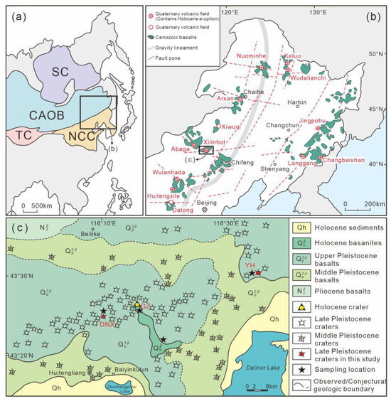 (a) Regional geologic map of the eastern Eurasian continent (modified from [7]). CAOB, central Asian orogenic belt; NCC, North China craton; SC, Siberian craton; TC, Tarim craton. (b) Map of Cenozoic basalts and Quaternary volcanoes in Northeast China (modified from [3,28]). (c) Map of volcanic cones in the XVF. DNX, Danaoxi; GZ, Gezishan; YH, Yihewula.