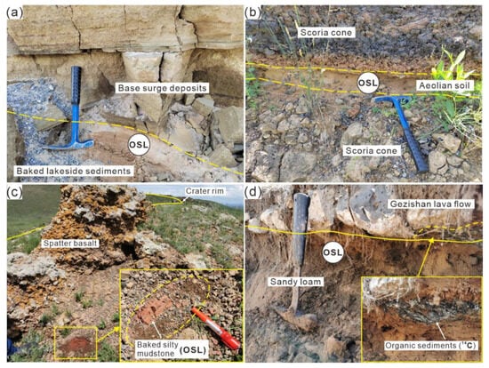 From a chronological perspective, previous studies have reported a K-Ar age of ~0.33 Ma for the basaltic lava within the Gezishan crater [18], suggesting a Middle Pleistocene origin. However, the K-Ar and Ar-Ar methods are no longer suitable for constraining the eruption times of young volcanoes, particularly those from the Holocene, due to its relatively large dating errors and reduced reliability. At a distant location to the east of Gezishan (Figure 4a), volcanic scoria overlays Late Pleistocene loess (Figure 4b), with a baked layer approximately 1–2 cm thick. The thermoluminescence (TL) age of this baked layer sample was determined to be 22.41 ± 1.90 ka [17], representing an early eruptive event at Gezishan. In this study, we performed OSL dating on silty mudstone, which is the surrounding rock found within the spatter lava along the southern rim of the Gezishan crater. The dating results indicate an age of 7.86 ± 0.10 ka, corresponding to the volcano’s late-stage eruption. It is well established that abundant vegetation around an eruptive center can lead to the burial of charcoal or organic sediments within volcanic deposits, pyroclastic flows, or lava flows. These materials serve as vital sources of organic evidence for documenting relatively young volcanic eruptions in the region [35,36]. A small amount of grayish-black organic sediment was found at the bottom of the late-stage lava flow in the southern part of Gezishan. Radiocarbon. Dating of this sediment yielded ages about 6.8 cal. ka BP (Table 3). Both OSL and radiocarbon dating results show the Gezishan volcano was still erupting during the Holocene, rather than terminating in the Late Pleistocene.