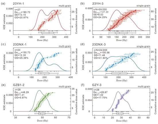 The KDE of equivalent dose values for OSL samples from XVF. (a,b) Loose lakeside facies sediments baked by Yihewula base-surge deposits. (c,d) Eolian sand interlayer within Danaoxi scoria cone. (e) Brownish yellow sandy loam beneath the Gezishan lava. (f) Baked silty mudstone blocks within Gezishan spatter lava. Samples are distinguished by different colors. It includes the equivalent dose values calculated using the Central Age Model (De-CAM) and Minimum Age Model (De-MAM), the standard error (SE), and the overdispersion (OD) of all data points. The ratio of n/N represents the number of screened measurements to the total number of measurements. Grains were rejected for the following reasons: (1) The initial Tn signal is less than 3σ above the corresponding background count. (2) The recuperation ratio (i.e., the ratio of the Lx/Tx values (regenerative dose/text dose) for the 0 Gy and maximum regenerative doses) is >5%. (3) The recycling ratio (i.e., the ratio of Lx/Tx values for the duplicate regenerative doses) is not consistent with unity at 2σ.