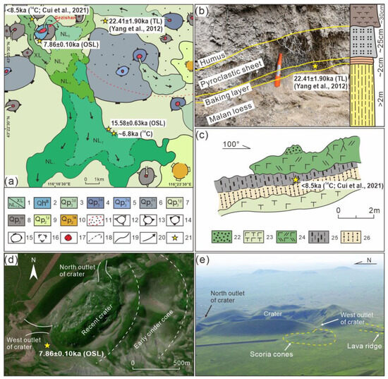 (a) Geological map of Gezishan volcano (modified from [17]) [37]. (b) Gezishan pyroclastic sheet [17]. (c) Gezishan west lava flow [37]. (d,e) Aerial views of the Gezishan volcano in the XVF. 1, lava units from Gezishan volcano; 2, Holocene pyroclastics/rocks; 3, Late Epipleistocene tholeiite; 4, Late Epipleistocene pyroclastics; 5, Middle Epipleistocene extrusive basalt; 6, Middle Epipleistocene tholeiite; 7, Early Epipleistocene tholeiite; 8, Early Epipleistocene pyroclastics/rocks; 9, Early Middle Pleistocene alkali basalt; 10, Middle Pleistocene pyroclastics/rocks; 11, fall pyroclastic sheets; 12, fall cinder cone; 13, fall-spatter cone; 14, lava dome; 15, shield volcano; 16, residual cone; 17, crater; 18, lava unit boundary; 19, geological boundary; 20, direction of lava flow; 21, sample location; 22, scoria; 23, alkaline basalt; 24, basanite; 25, black soil; 26, sandy loam.