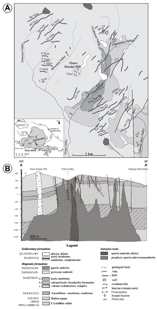 (A). Geological sketch map of the Nistru area showing the lateral zonation of the ore deposits in the NW–SE orefield. (B). Cross-section A–A’ (NW-SE) after Damian et al. [45] and sample location (◊) in the Vein 143 (Lat. 47°33′365″ N./Long. 23°46′5639″ E).