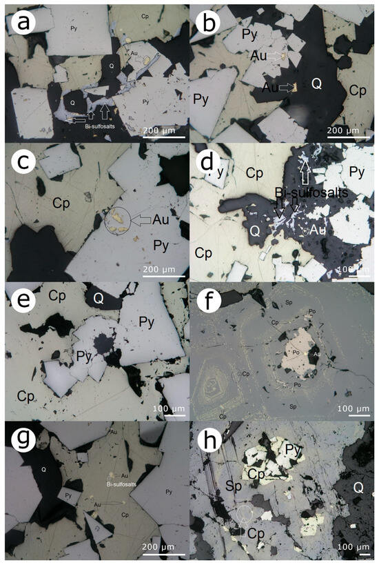 Photomicrographs in reflected light showing textural aspects of the assemblage containing native gold and Bi-sulfosalts. (a) Native gold—Bi-sulfosalts—sulfides assemblage. (b) Native gold inclusion in pyrite and in euhedral quartz. (c) Native gold inclusion in pyrite. (d) Pyrite associated with chalcopyrite and Bi-sulfosalts within quartz. (e) Radiating aggregates and euhedral crystals of pyrite inclusion in chalcopyrite. (f) Pyrrhotite as a small crystal associated with the native gold on growth surfaces within sphalerite, sphalerite contains exsolutions of chalcopyrite and of pyrrhotite. (g) Chalcopyrite with inclusions of native gold and Bi-sulfosalts, quartz pyrite. (h) Sphalerite as coarse aggregates with abundant chalcopyrite exsolutions, containing euhedral crystals of pyrite and chalcopyrite. Abbreviations: Au—native gold; Cp—chalcopyrite; Py—pyrite; Po—Pyrrhotite; Q—quartz.