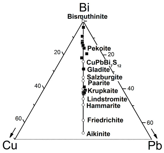 EPMA data for bismuthinite derivatives (Bi4S6-Cu2Pb2Bi2S6) are given in Table 1. The series contains intermediate members between bismuthinite and aikinite [55], including several more recently discovered minerals (salzburgite, paarite and emilite [56].