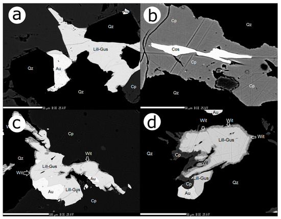 (a) Lillianite-Gustavite and native gold as inclusions on the boundaries between chalcopyrite and idiomorphic quartz. (b) Lamellar cosalite within chalcopyrite in a matrix of quartz. (c) Lillianite-gustavite–native gold assemblage bordered by wittichenite located at boundaries between quartz and chalcopyrite. (d). Wittichenite as rims around lillianite-gustavite crystals and between relict crystals of chalcopyrite included in quartz; Abbreviations: Au—native gold, Cos—cosalite, Cp—chalcopyrite, Lill-Gus—lillianite-gustavite, Qz—quartz, Wit—wittichenite.