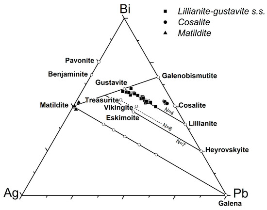 Cosalite was optically identified as lamellar crystals included in chalcopyrite (Figure 6b; Sample NV-8). Compositionally, the phase is reasonably close to ideal stoichiometry (Table 3, Figure 7) albeit with 1.31 to 1.68 wt.% Ag and 1.83 to 2.37 wt.% Cu). Comparable Ag and Cu contents are reported by Voudouris et al. [25], Pazout et al. [4] and Mederski et al. [20]. The formation of cosalite together with lillianite homologs may be due to the Cu content, which is less readily incorporated into the lillianite structure [62]. The presence of Cu in solution can cause the destabilization of gustavite and the formation of cosalite [63]. A substitution mechanism for Cu in cosalite was described by Topa and Makovicky [64].