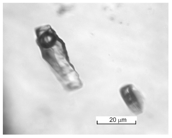 The formation temperature for the Cu+Bi+Au vein was estimated from a fluid inclusions study. The examination of a great number of double-polished plates allowed us to find primary fluid inclusions greater than 15 μm in size in quartz, which were suitable for the investigation. Primary, pseudo-secondary and secondary inclusions were recognized according to criteria given by Roedder [65]. The primary fluid inclusions are regularly distributed in host quartz or occur along growth zones, while secondary inclusions heal fractures, cutting the host mineral. The pseudo-secondary fluid inclusions heal the fractures within crystals, but these fractures do not reach the crystal surface; at the same time, the phase composition of these inclusions is similar to that of primary inclusions.