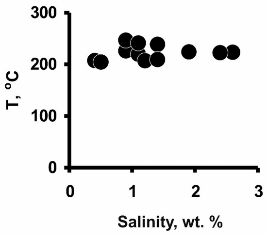 The results of thermo- and cryometric investigations of (n = 36) individual fluid inclusions in quartz of the studied vein (Table 4, Figure 9) indicated the dominance of NaCl, KCl and MgCl among the two-phase fluid solutions of admixtures. This is evidenced by chloride eutectics of the admixture solutions in the temperature interval from −21 to −35 °C (Table 4). Complete homogenization of the fluid admixtures takes place in a narrow temperature interval (from 205 to 247 °C). Salinities vary between 0.4 and 2.6 wt.% NaCl equivalent. The density of the fluid changes from 0.8 to 0.87 g/cm3. A slight increase in salinity as temperature decreases is noted (Table 4), with higher temperatures corresponding to lower salinity. The very low salinity would suggest that mixing between hydrothermal solutions and meteoric water was an important mechanism for the successive deposition of the mineral components.
