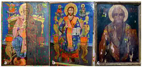 Images of the three Royal icons before restoration showing the number of areas (spots) analyzed by XRF in situ (in black for (a,b), in white for (c)) and the areas from where samples were taken for ATR/FTIR analysis and cross-sections (cs) preparation and analysis (in yellow for (a,c) followed by the code cs written after the number of the spot analysis).