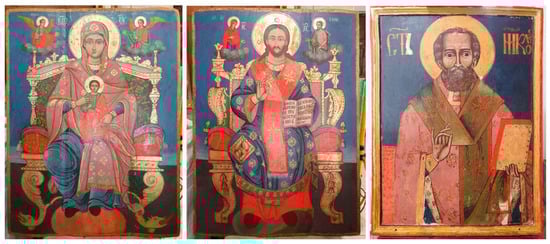 The icons under study show a general state of good conservation, without serious forms of degradation that could endanger their structural integrity. This natural degradation process is marked by the environmental factors that have acted on the paintings, generating a loss of their original qualities. Thus, the constituent materials underwent aesthetic, structural, and physical–mechanical changes. However, traces of the transformations undergone over time and partial minimal interventions for the two similar painted icons of Mother of God and Jesus Christ, or the total overpainting of the Saint Nicholas icon revealed after restoration (Figure 2), were visible both at the level of the support layer and at the level of the pictorial layer, particularly in the lacunar areas with significant loss of material.