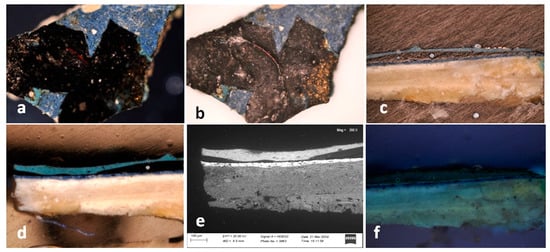 Optical images of sample MD4cs blue from the background, on the upper left side, near the corner of the icon of Mother of God: (a) 50×_P, (b) 50×_R, and the MD4cs cross-section images: (c) 100×_R, (d)100×_P, (e) SEM image at 200× magnification and (f) 100×_UVF.