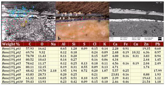 As seen in optical and SEM BSC cross-section images (b) and (c), from Figure 7 and also confirmed by elemental EDX results and ATR-FTIR, in the overpainting layers was detected: the schlagmetal/brass leaf (Base(19)_pt2) applied over a layer of possibly Prussian blue mixed with zinc white and little lead white (Base(19)_pt1, Base(19)_pt3, Base(19)_pt9, Base(19)_pt10). In the blue original layer was detected the presence of blue ultramarine lazurite (confirmed also by ATR-FTIR) mixed with lead white (Base(19)_pt7) onto which a relatively thick layer of natural resin with oil (Base(19)_pt4, Base(19)_pt5, Base(19)_pt6) was applied (no fluorescence in UV, Figure 6, image (f)). The ground preparation layer was made by applying a mixture of chalk with animal glue (confirmed also by ATR-FTIR); no sulfur was detected in the analyzed area to confirm the presence of gypsum (Base(19)_pt8).