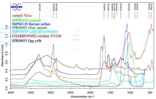 In the resulting spectra of the sample N2cs could be observed the IR bands characteristic of the precious mineral ultramarine blue pigment lazurite at 1026 cm−1 and 1058 cm−1 (S), those specific to the proteinaceous materials amide groups AI, AII, and AIII characteristic of egg yolk binder (tempera), and also of animal glue from the gesso primer support layer. Gypsum IR specific bands at 3557 cm−1, 3410 cm−1, 1136 cm−1 (S), 1622 cm−1, and 671 cm−1, and the green chrome viridian IR bands at 533 cm−1 (M) and 448 cm−1 (S) were also identified in the spectra. Viridian, a chromium (III) oxide dihydrate green pigment, was used mostly in the second half of the 19th century, especially for replacing emerald green, which was very poisonous. Also observed in the spectra was the presence of zinc white with its strong IR peak at 418 cm−1 and of barium sulfate used as a filler in the overpainting layers.