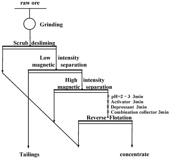 Subsequently, the best non-magnetic products were reversed flotation by XFD-IV (Changchun Prospecting Machinery Factory, Changchun, China) type single cell flotation machine. The overall beneficiation flow chart is depicted in Figure 1. The ultimate objective is to obtain quartz fine powder with the proportion of SiO2 exceeding 99.6%, which will serve as raw material for subsequent calcination condition experiments and mechanism research.