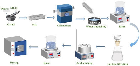 High-purity quartz is utilized in the aerospace, semiconductor, photovoltaic, electronics, and other emerging industries due to its excellent physical and chemical properties []. In recent years, with the development of high-tech industries, high-purity quartz production is in short supply, and quartz resources with higher purity are being gradually depleted. Moreover, some countries do not have high-purity quartz deposits at all. It is very urgent to develop the technology of using low-quality quartz resources to prepare high-purity quartz. Although the low-quality quartz resources such as powder quartz, quartz sandstone and river sand have huge reserves, they are generally used only in the low-end ceramics and metallurgy industries []. If we can improve their purity through better technology, there will be more raw materials for high-tech industries.