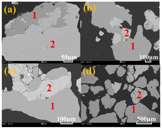 SEM pattern of raw ore. While area-1 is quartz and area-2 is Feldspar. ((a–d) are SEM images at different magnifications, electronic signal: backscattered electrons).