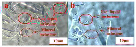 Optical microscope images of pre-treated quartz showing gas–liquid inclusions. ((a,b) are the images of inclusions observed at different locations).