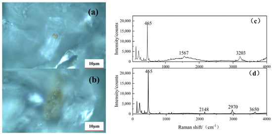 The optical microscope images of the pre-treated quartz are presented in Figure 5, revealing a significant presence of gas–liquid inclusions with particle sizes ranging from 1–10 μm. The majority of these inclusions exhibit a clustered spherical distribution, while a smaller portion is dispersed in spindle and bar shapes. Additionally, there are mineral inclusions present, which appear rounded and fusiform with particle sizes around 5–10 μm. Figure 6 displays the Raman microscope images and representative spectra of inclusions. Laser Raman analysis indicates characteristic Si-O vibration peaks at 465 cm−1, O2 peaks at 1567 cm−1, and liquid -OH peaks at 3203 cm−1, suggesting that the main components of the inclusions are O2 and H2O. Furthermore, Raman spectra also reveal traces of hydrocarbon fluid with characteristic peaks at 2970 cm−1.