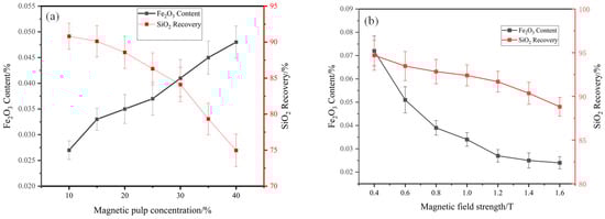 The pulp concentration test was set by controlling the magnetic concentration of 10%, 15%, 20%, 25%, 30%, 35% and 40% respectively, and the results of magnetic separation (Figure 7a) indicate that the recovery rate of quartz decreases with the increase of pulp concentration, and the rate of decline increases gradually. In addition, the content of Fe2O3 increases with the increase of pulp concentration. Notably, the Fe2O3 content reaches its minimum at a pulp concentration of 10%. This phenomenon can be attributed to higher slurry concentrations facilitating the adhesion of magnetic substances to non-magnetic surfaces, thereby elevating Fe2O3 content. Additionally, increased slurry density leads to quartz being more readily trapped among magnetic media, which in turn reduces SiO2 recovery rates [].