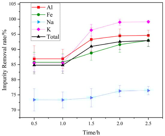According to the above experimental results, NH4Cl (2 wt%) doping was used for microwave calcination to explore the effect of calcination time on the removal of main impurities. The calcination temperature was 900 °C, and the holding time was controlled for 0.5 h, 1.0 h, 1.5 h, 2.0 h and 2.5 h, respectively. The results after leaching were shown in Figure 8. It can be seen from the impurity removal rate curve that with the increase of holding time, the removal rate of all impurities increases, and tends to be flat after 2 h. The results show that increasing the holding time can indeed accelerate the leaching effect of Al, K, Fe and other elements, so the subsequent experiment should be carried out on the basis of constant temperature calcination for 2 h.