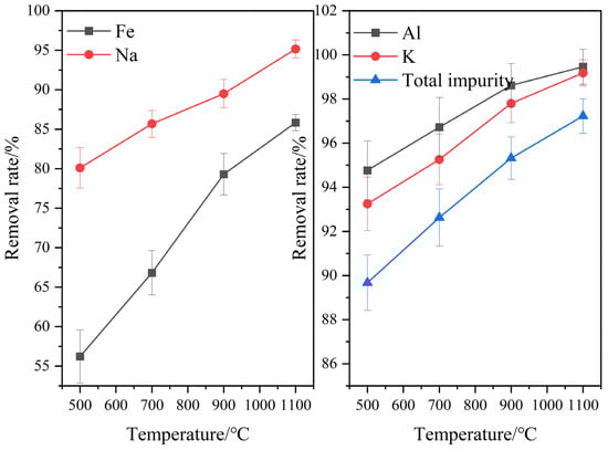 In order to explore the influence of calcination temperature on the removal effect of main impurities, the calcination temperature was controlled as 500 °C, 700 °C, 900 °C, 1100 °C, and the calcination time was 2 h. The experimental results of the calcination temperature are shown in Figure 9. It can be seen from the impurity removal rate curve that the removal rates of Al and K impurities gradually increase with the increase of temperature, and the removal effect is best at 1100 °C. The removal rates of Na and Fe showed a slightly fluctuating trend with the increase of temperature. Fe had the best removal effect at 900 °C, while Na had the best removal effect at 1100 °C. Considering the removal effect of all impurities, 1100 °C should be selected as the best calcination temperature.