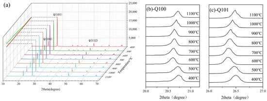 The in-situ XRD image of calcined quartz is shown in Figure 11a, and partial enlarged images are shown in Figure 10b,c. It can be observed from the figure that at 400 °C, the sample closely matches the standard diffraction peak of α-quartz (JCPDS: 01-078-4811). As temperature increases, the position of the main diffraction peak shifts within the range from 500 °C to 600 °C (as shown in Figure 11b,c), indicating a crystal transformation in progress. This aligns with recorded β-quartz (high-temperature quartz, JCPDS: 04-006-5049) transition temperatures in the existing literature [,], and this deviation gradually increases as calcination temperature rises. Wei et al.’s study on phase using density functional theory has demonstrated that such crystal phase transition facilitates interstitial impurity migration []. Upon original α-quartz overcoming energy barriers to transform into β-quartz, Si-O bond length within the lattice shortens, resulting in a larger change in interstitial volume caused by phase transition—thus promoting interstitial impurity migration to the surface and facilitating impurity removal.