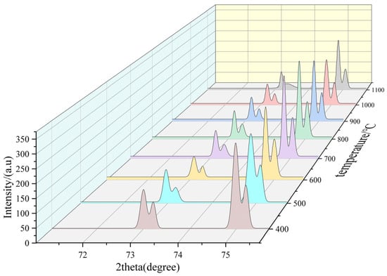 In addition, the analysis in Figure 11 also shows that the characteristic peak intensity of Q (101) crystallographic plane increases slowly with the increase of temperature. This indicates that the main crystal plane diffraction intensity of quartz is increasing. At the same time, there are double distinct characteristic diffraction peaks of aluminum silicate (JCPDS: 01-078-0436) at 73.206° and 75.477° compared to quartz, as shown in Figure 12. It can be observed that the area of the characteristic diffraction peaks of aluminum silicate decreases with increasing calcination temperature. This indicates that the crystalline phase of aluminum silicate also undergoes changes during the calcination process, which may be beneficial for subsequent impurity removal.