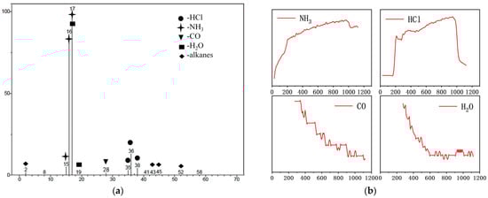 MS curve of mixed calcination of quartz and NH4Cl (2 wt%): (a) Mass spectrometric analysis of gas produced during calcination; (b) The gas content curve varies over time.