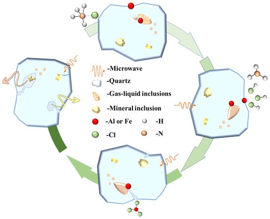 According to the analysis results of SEM, in-situ XRD, and TG-MS, the following model of the calcination process can be verified (see Figure 15). The TG-MS curve of calcination indicates that NH4Cl decomposes into NH3 and HCl gases at lower microwave heating temperatures. As the temperature increases, the crystal cell parameters of quartz expand, leading to an enlargement of the crystal cell volume and migration of impurities within lattice defects, as evidenced by in-situ XRD results. Subsequently, HCl reacts with surface impurities on quartz such as Al and Fe, disrupting the crystal lattice and resulting in the formation of water and chloride compounds. Concurrently, in-situ XRD analysis reveals a reduction in the diffraction peak area corresponding to aqueous aluminum silicate within quartz, signifying alterations in its crystal lattice structure. It is plausible that larger inclusions within quartz are selectively heated due to their superior wave absorption properties, causing fracture and localized fusion of these inclusions. According to the existing literature, aluminum chloride and ferric chloride have boiling points of 178 °C and 316 °C, respectively; thus, when temperatures reach 200–300 °C [], chlorides sublime while removing certain impurities from the quartz surface—evident through cracks and corrosion pits observed in SEM images. With further temperature elevation, gas–liquid inclusions escape through these fractures while mineral inclusions (predominantly aluminosilicates) continue reacting with HCl present in the fissures before sublimating at elevated temperatures to facilitate comprehensive removal of internal impurities.