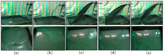 Flowing and diffusing states at the nozzle in the gravity flow test of different concentrations of slurry: (a) 80%, (b) 78%, (c) 76%, (d) 74%, (e) 72%. Adapted from Ref. [28].
