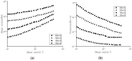 The effect of slurry concentration on the rheological properties of slurry. Adapted from Ref. [32]. (a) Relationship between shear stress and shear rate, (b) Relationship between viscosity and shear rate.