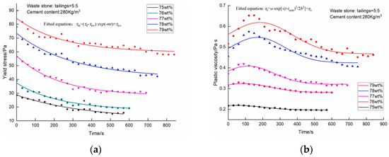 The thixotropy of fill slurry is another critical factor influencing the transportation process in slurry backfilling [33,34,35,36]. Thixotropy describes the property of a fluid where its viscosity changes under shear stress, gradually returning to its original state once the stress is removed. Investigating the thixotropy of fill slurry offers critical insights for optimizing long-distance pipeline transportation [37,38,39,40]. Figure 6 illustrates the thixotropic behavior of rheological parameters. The relative slip between slurry flow layers is directly governed by the magnitude of the slurry’s yield stress. In essence, the magnitude of the fill slurry’s yield stress directly dictates the radius of the plug flow and the thickness of the boundary layer. Figure 6a reveals that yield stress decreases with increasing shear time, following a negative exponential trend. Figure 6b indicates that plastic viscosity generally declines over time but surges sharply at the onset of shear (shear transition zone). Viscosity rapidly increases with shear time, initially reaching a peak, then gradually decreasing before stabilizing [41,42]. The mixing time for preparing the fill slurry should generally exceed the duration of the shear transition zone.