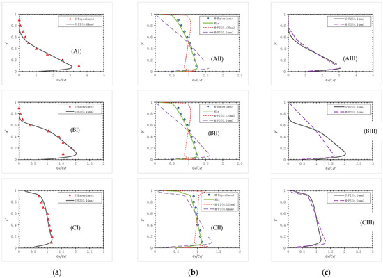 Additionally, particle size distribution significantly influences the transport performance of fill slurry [43,44]. Figure 7 demonstrates the impact of incorporating fine particles on the particle concentration distribution within the fill slurry [45,46]. In Figure 7, panels A, B, and C depict the particle volume concentration distributions under conditions of low flow rate with low concentration, low flow rate with high concentration, and high flow rate with high concentration, respectively. The addition of 10% fine particles results in minimal changes to the coarse particle concentration distribution; however, introducing 20% fine particles leads to a gradual alteration in the concentration distribution of coarse particles. This suggests that a sufficient quantity of fine particles is required to modify the flow behavior of the fill slurry. Incorporating an optimal proportion of fine particles into the fill slurry can significantly enhance the suspension of coarse particles, reduce the frictional resistance between coarse particles and the pipe wall, and consequently improve the overall transport performance of the slurry. Concurrently, as the flow rate increases, the impact of fine particles on the coarse particle concentration distribution progressively diminishes. This may be attributed to the fact that, as the flow rate rises, the collision forces among coarse particles intensify, overshadowing the buoyancy effect imparted by the fine particle carrier phase.