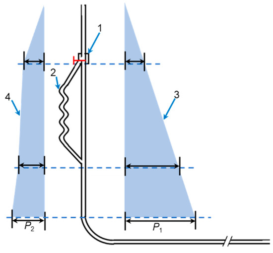 Increasing resistance and reducing pressure schematic of auxiliary pipe: (1) program-controlled electric valve; (2) auxiliary pipe; (3) pressure change of vertical pipe of L-shaped pipe; (4) pressure change of vertical pipe after using auxiliary pipe. Adapted from Ref. [57].