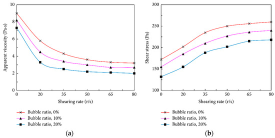 Figure 11 and Figure 12 illustrate the effects of foaming agents on both the rheological properties and pipeline transport performance of fill slurry [58]. Foaming agents, functioning as surfactants, organize their bilayer electronic structure at the liquid film surface, thereby effectively reducing the liquid’s surface tension and facilitating the formation of bubbles with the surrounding air. With an increasing bubble ratio, both the apparent viscosity and shear stress of the fill slurry progressively decrease. Consequently, foaming agents can markedly enhance the flowability of the fill slurry. Initially, the bubbles are large and irregular upon entering the slurry. As transportation of the fill slurry commences, the large bubbles ascend uniformly to the pipe wall surface and the surrounding space. Under the persistent shear force exerted by the pipe wall, large bubbles fragment into smaller bubbles, creating a new turbulent viscous layer on the pipe wall surface that replaces the existing viscous layer of the slurry. Hence, the incorporation of foaming agents can diminish resistance loss during the transportation process and enhance pipeline transport efficiency.