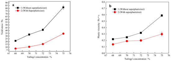 Effect of a superplasticizer on the rheological behavior of slurry. Adapted from Ref. [59]. (a) Yield stress, (b) Plastic viscosity.