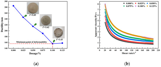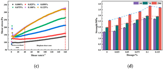 In backfill operations, thickeners are employed to improve the water retention capacity of the fill slurry and to mitigate issues related to segregation and blockage during pipeline transport. Figure 14 illustrates the mechanism of action of a thickening agent [67]. The molecules of the thickening agent possess a multi-segment structure. Upon adsorption onto the particle surfaces, the segments of the thickening agent molecules undergo rotational movement, resulting in the aggregation of particles into larger floccules. These floccules form interconnections within the paste slurry, creating a network-like flocculation structure. Figure 15 depicts the effects of the thickening agent on the flowability, rheological properties, and compressive strength of the fill slurry. Figure 15a demonstrates that the thickening agent effectively decreases the flowability of the fill slurry, leading to particle aggregation and enhancing the slurry’s resistance to bleeding and segregation. Figure 15b,c illustrate that, at a constant shear rate, a higher content of thickening agent results in an increase in the apparent viscosity and shear stress of the fill slurry. Figure 15d reveals that the compressive strength of hardened fill body specimens increases substantially with the amount of thickening agent.