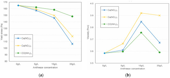 The impact of chloride-free antifreeze on the rheological properties of slurry. Adapted from Ref. [68]. (a) Yield stress, (b) Viscosity.