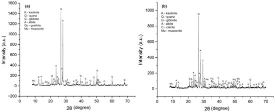 XRD patterns of the red ceramic tile formulations: (a) TC1; (b) TC4.