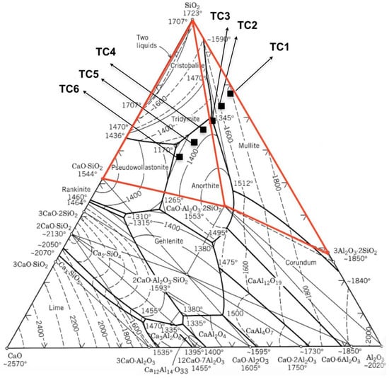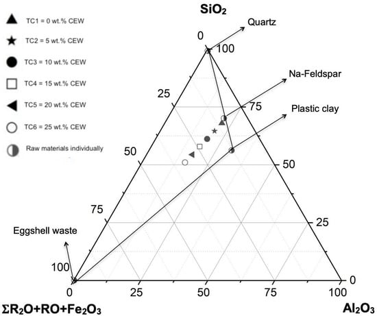 The physical properties of the bi-layered red ceramic tiles are directly related to the phases formed during the firing process, especially silicates, calcium silicates, and calcium aluminosilicates in the final product. Considering the complex ceramic formulations used in this work, the composition diagrams of the SiO2-Al2O3-Na2O and SiO2-Al2O3-CaO ternary systems were selected to predict the crystalline phases formed in the final tile product. Figure 3 shows the studied formulations plotted in the SiO2-Al2O3-Na2O ternary diagram. It was observed that all formulations belong to the quartz(SiO2)-albite(Na2OAl2O36SiO2)-mullite(3Al2O32SiO2) compatibility triangle. When the ceramic formulations were represented in the SiO2-Al2O3-CaO ternary diagram (Figure 4), they were in different compatibility triangles depending on the amount of chicken eggshell waste added. The TC1, TC2, and TC3 Formulations were within the quartz(SiO2)-anorthite(CaO·Al2O3·2SiO2)-mullite (3Al2O3·2SiO2) compatibility triangle. On the other hand, the TC4, TC5, and TC6 Formulations were located in the quartz(SiO2)-anorthite(CaO·Al2O3·2SiO2)-wollastonite (CaSiO3) compatibility triangle. Therefore, as the amount of chicken eggshell waste in the bottom layer increased above 10 wt.%, intense structural reorganization occurred, and the tile formulations moved toward the quartz–anorthite–wollastonite compatibility triangle. Consequently, a decrease in the mullite phase in the bi-layered red ceramic tile after firing should be expected.
