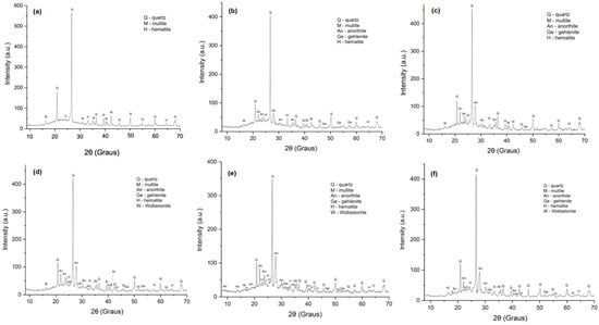 XRD patterns of bi-layered red ceramic tile pieces fired at 1220 °C: (a) TC1; (b) TC2; (c) TC3; (d) TC4; (e) TC5; (f) TC6.